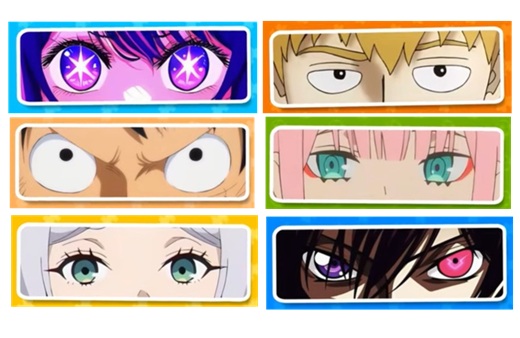 キャラの目を見て、登場しているアニメタイトル(先頭仮名のあ行~わ行などの行)を当てるアニメキャラ当てクイズ。炎炎ノ消防隊,薬屋のひとりごと,ダンダダン,鋼の錬金術師,進撃の巨人,デスノート,ハンターハンター,ドクターストーン,ワンピース,コ...